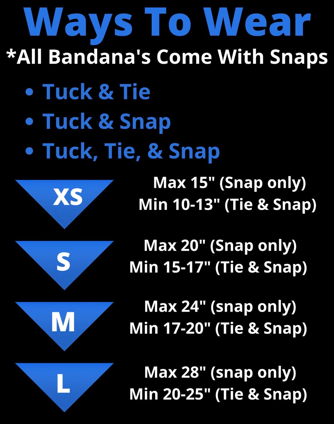 Small -21" across MAX 20" (Snap Only) MIN 15" - 17" (Tie & Snap)